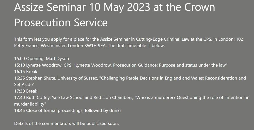 The Assize Seminars are back! The next one is on the 10th of May at the offices of the Crown Prosecution Service in London, and we have an exciting line-up (see pic). Places are limited, so sign up ASAP here: forms.office.com/e/ePbi3jP2ZV