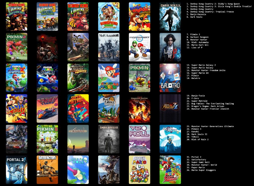 Big fan of old Monster Hunter, Pikmin 1-2-3, Donkey Kong Country, and Dark Souls