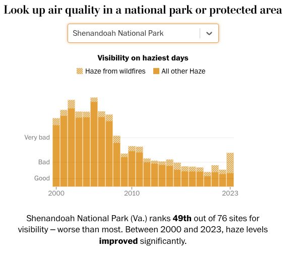 Nice WaPo article on air quality in National Parks, showing improvements in many parks followed by wildfire-driven reversals. Among the many impacts of wildfires, incl. directly loss of infrastructure as in Grand Canyon fires right now, smoke will make them way less enjoyable.