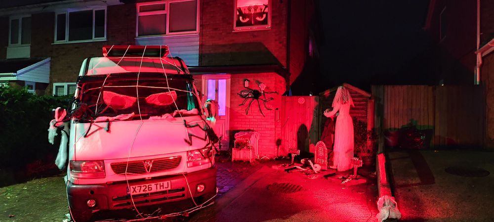 This year's theme for Halloween was Driven by Darkness: Evil on Wheels with a possessed evil motorhome talking to visitors. Lots of friendly people visiting, many compliments. Got to outdo myself next year!