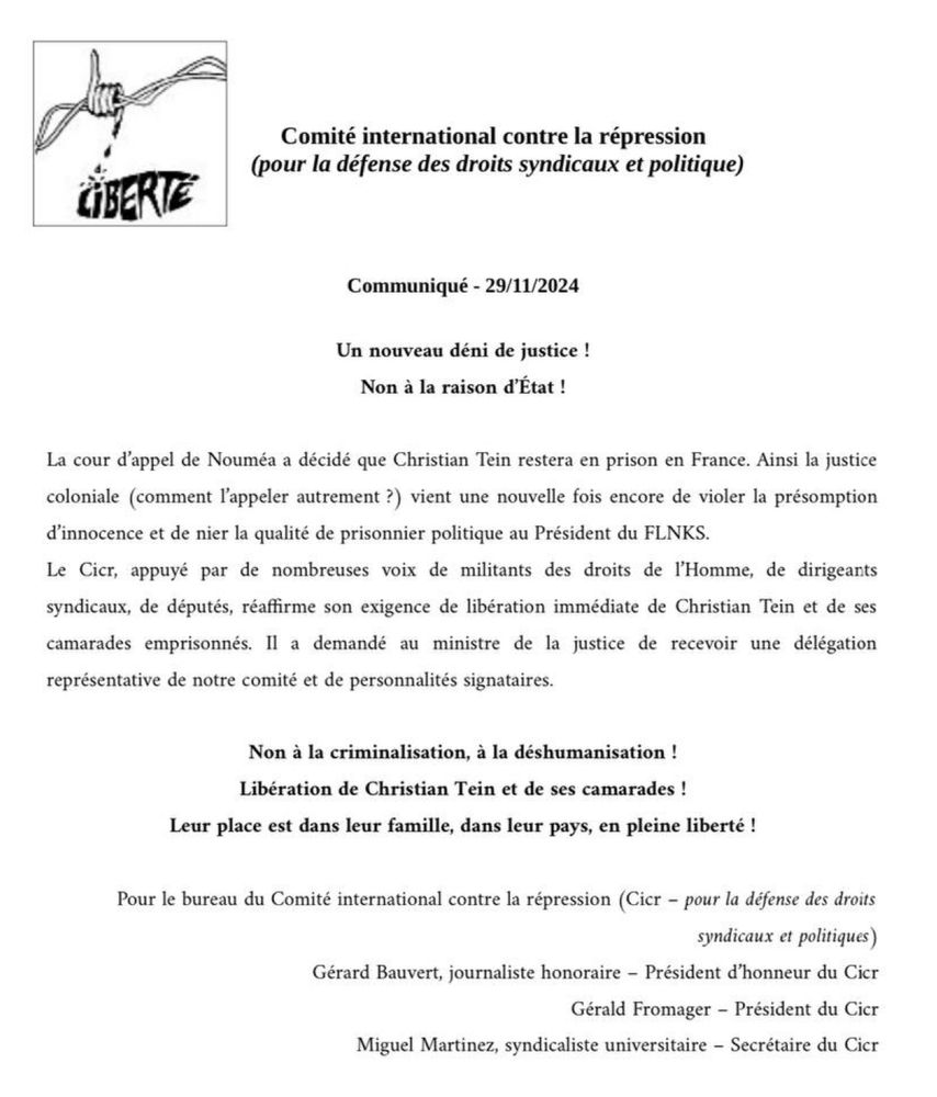 La cour d’appel de Nouméa maintient Christian Tein et ses camarades en détention. Justice coloniale… Les détenus kanaks sont des prisonniers politiques. Libération immédiate, comme vient de l’exiger le CICR ! Le combat pour leur liberté doit s’amplifier.
