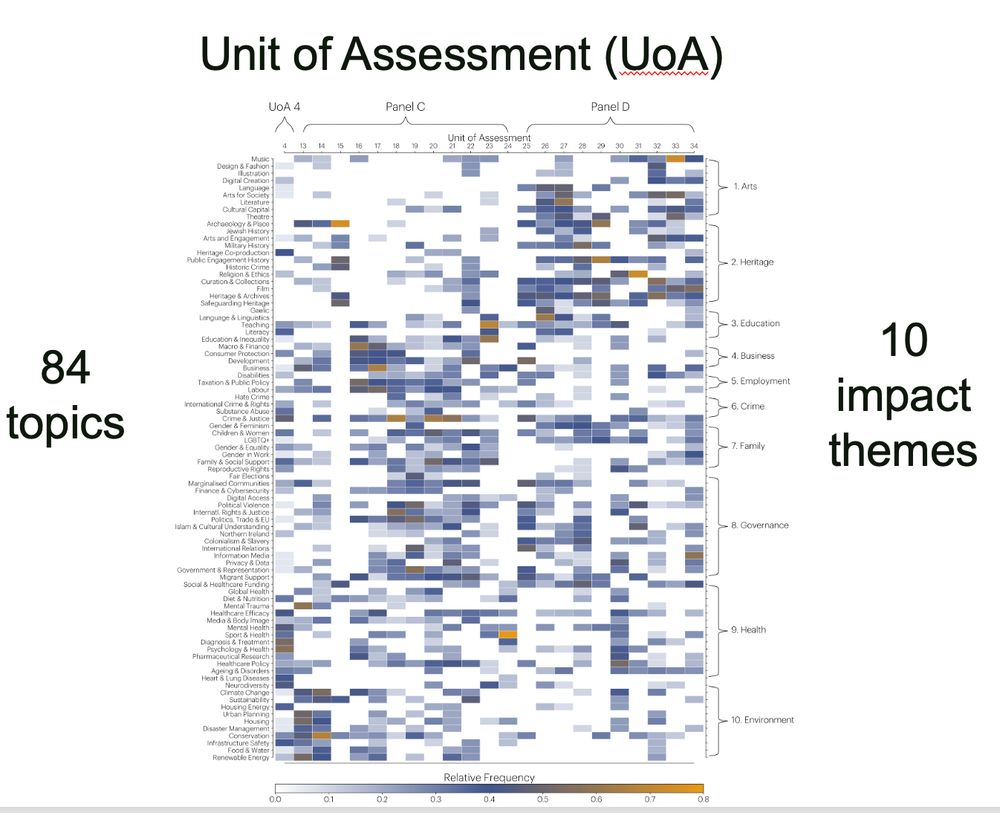 Here's a heatmap of 84 topics we found, across 10 themes and the Unit of Assessments