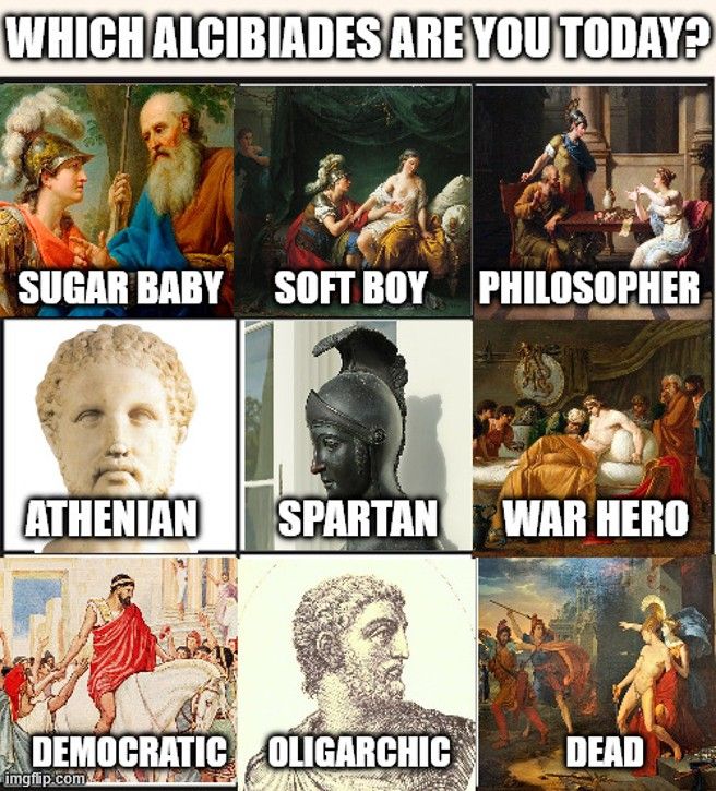 Els canvis de jaqueta de Cantó son tots en un mateix espectre polític, però Alcibíades no li fa fàstics a res: tant incita un cop oligàrquic com lidera l'oposició democràtica al mateix; tant serveix a Atenes com Esparta o Pèrsia. S'ha de saber caure molt bé de peu.