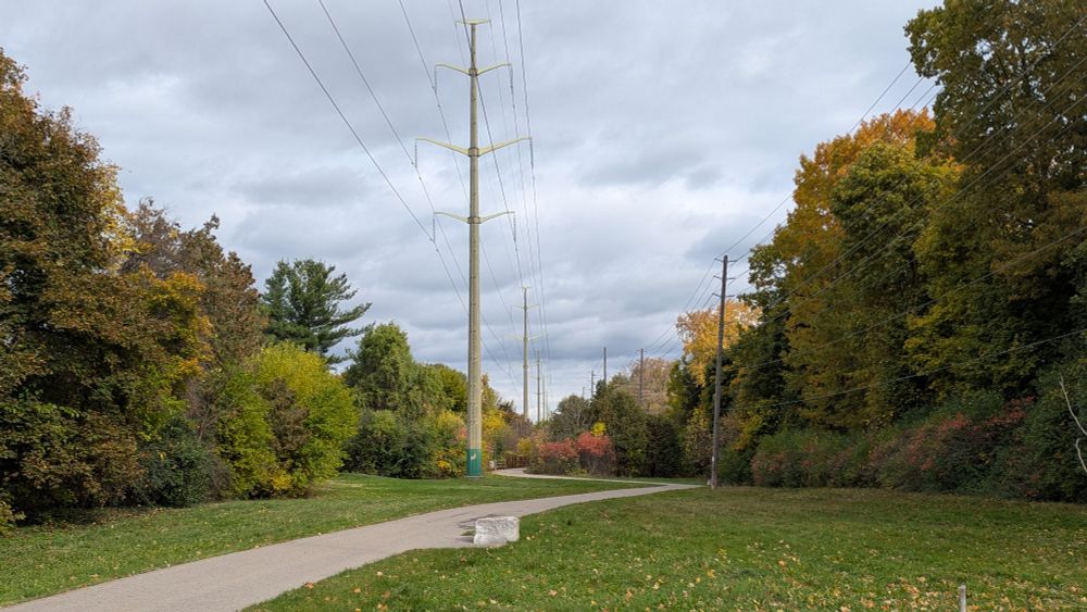 At Westfield Drive, the trail ends, and the hydro infrastructure gets a little crazy. One corridor splits off to the north, another plunges underground, and the spine of it all continues east. But the stations and junctions are fenced off in a way that you're boxed into a dead end.