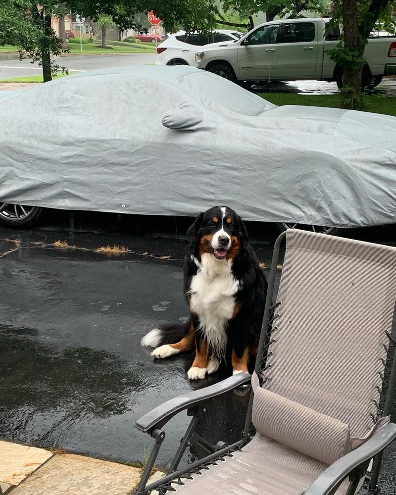 This is him refusing to come inside on a wet rainy day when he decided he would rather go for a ride in the car. Yeah, he is a Berner for sure.