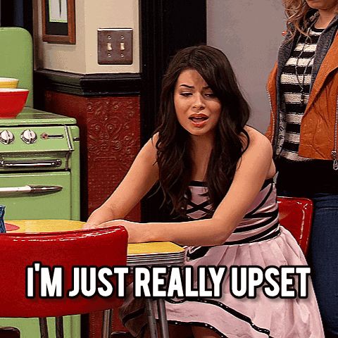 ALT: a woman sitting at a table with the words i 'm just really upset written on the bottom