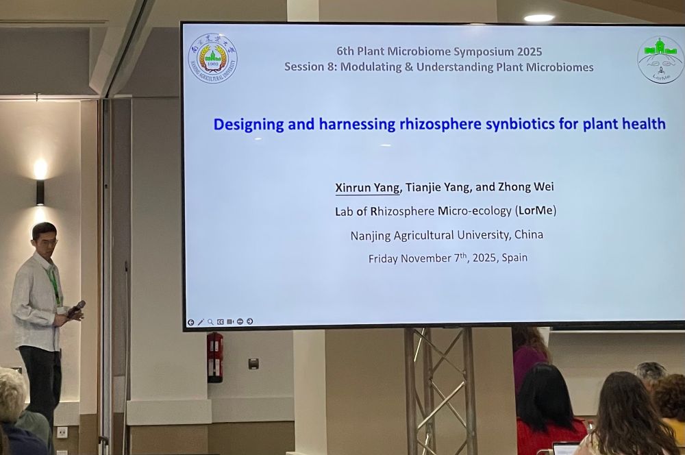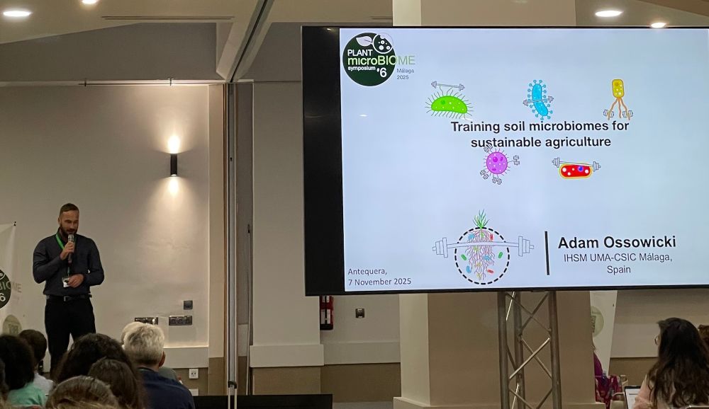 The last talk of #PMS2025 is the third selected talk from @vcarryon.bsky.social group in Malaga, the morning activity organizer and runner @adamoss.bsky.social on Training soil microbiomes for sustainable agriculture