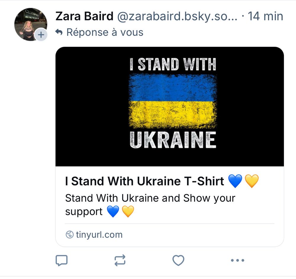 Troisième bot russe aujourd’hui avec un abonnement qui envoie un lien commercial bidon vers des t-shirts “Stand for Ukraine”