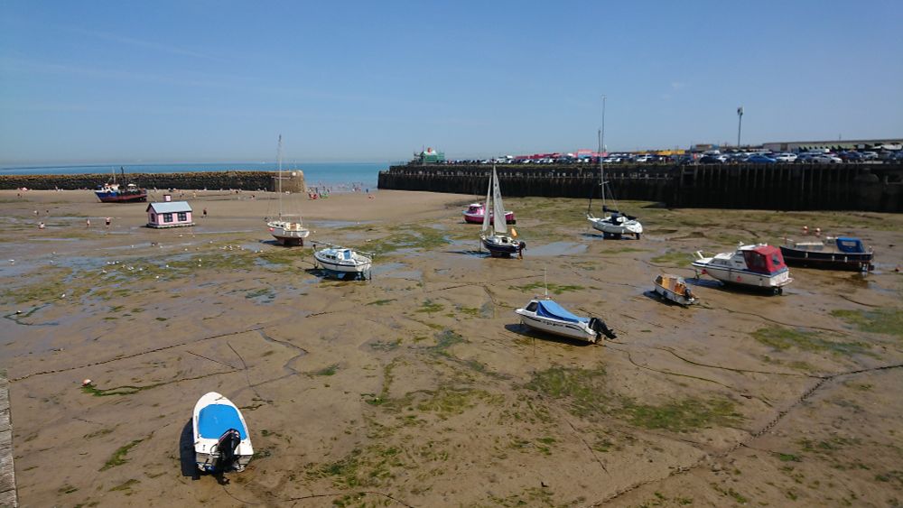 The harbour at low tide, with people lying sunbathing in it & walking out of it for a swim! Note the pink house, which has been floating here for a few years. It was part of an arts project. #Folkestone SE Coast 🩵🐬🌴