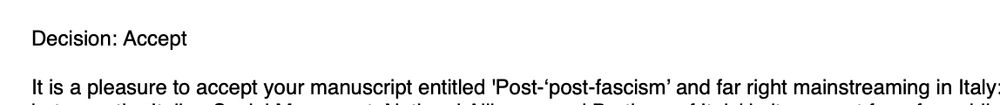About three years after Matteo Cavallaro and I first started thinking about this babe, it will finally see the light of publication. Stay tuned for the answer to the question 'But is Fratelli d'Italia really THAT close to the Movimento Sociale Italiano, and does it matter?'