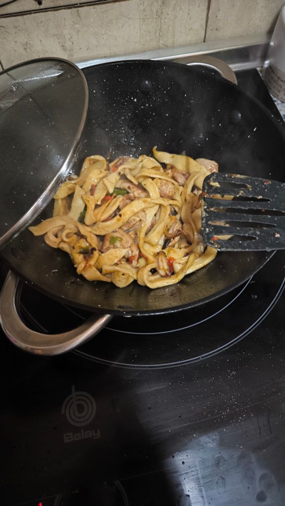 El otro día me salió un TikTok de pasta casera y hoy he probado a hacerlos picantes con verduritas y pollo.