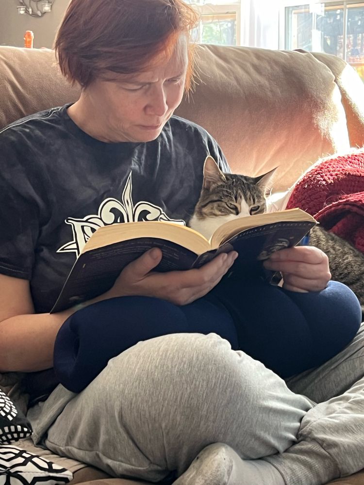 My kitty, Jezebel, loves to read with me!🥰