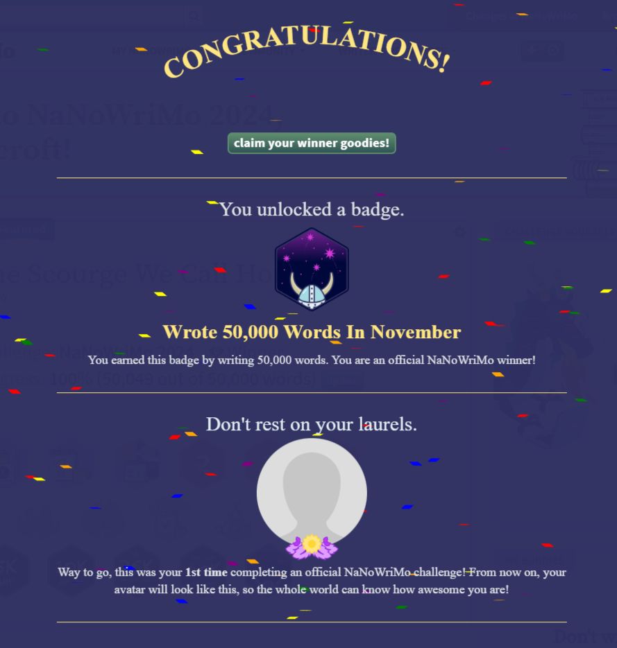 The novel is by no means done, but I managed just over 50 thousand words in the month and I'm still incredibly proud of myself