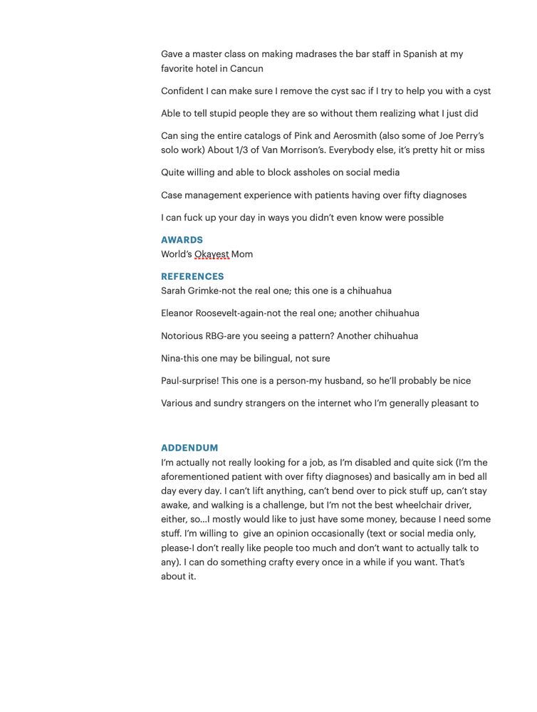 Waiting for my tube feed to settle, so, killing some time with nonsense. I'm #disabled from #eds, but here's my current pretend resume. #MCAS #POTS #gastroparesis #spoonies #tubies #chronicillness #sothissucks