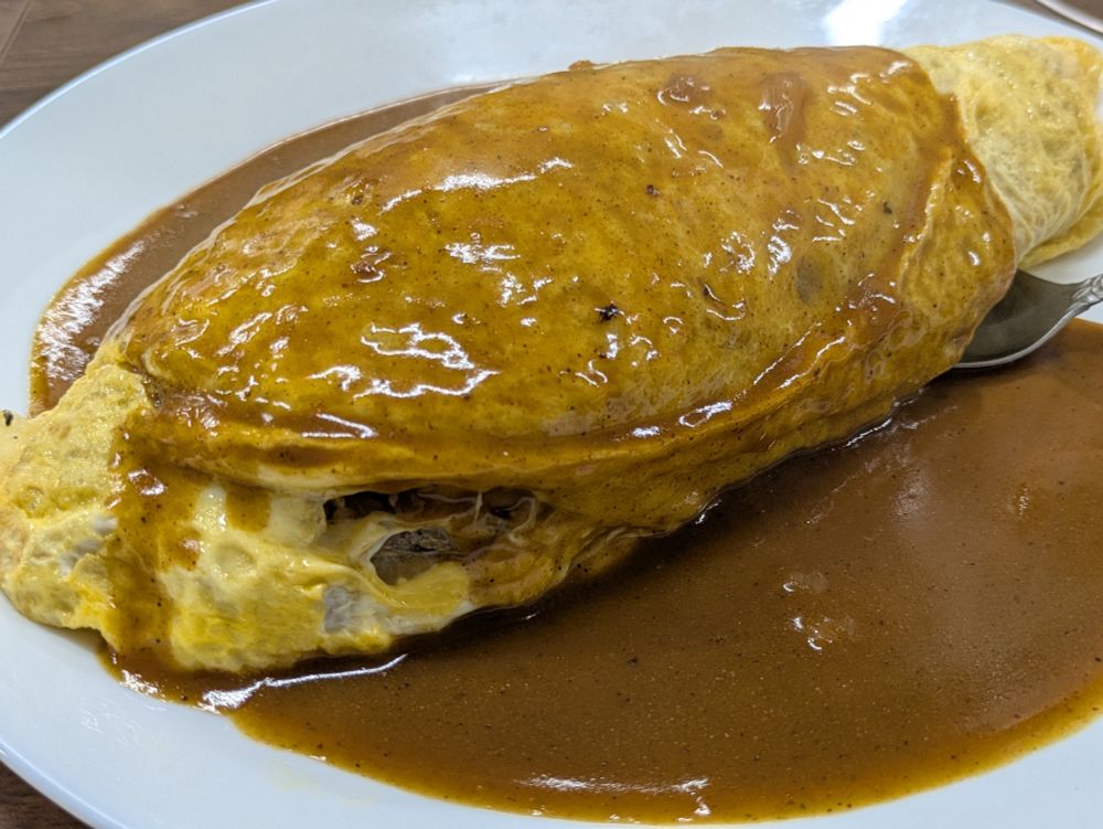 中身カレーピラフだった。オムレツ乗っけるようなのでなく薄い玉子できちっと巻いてるのも私好みであった