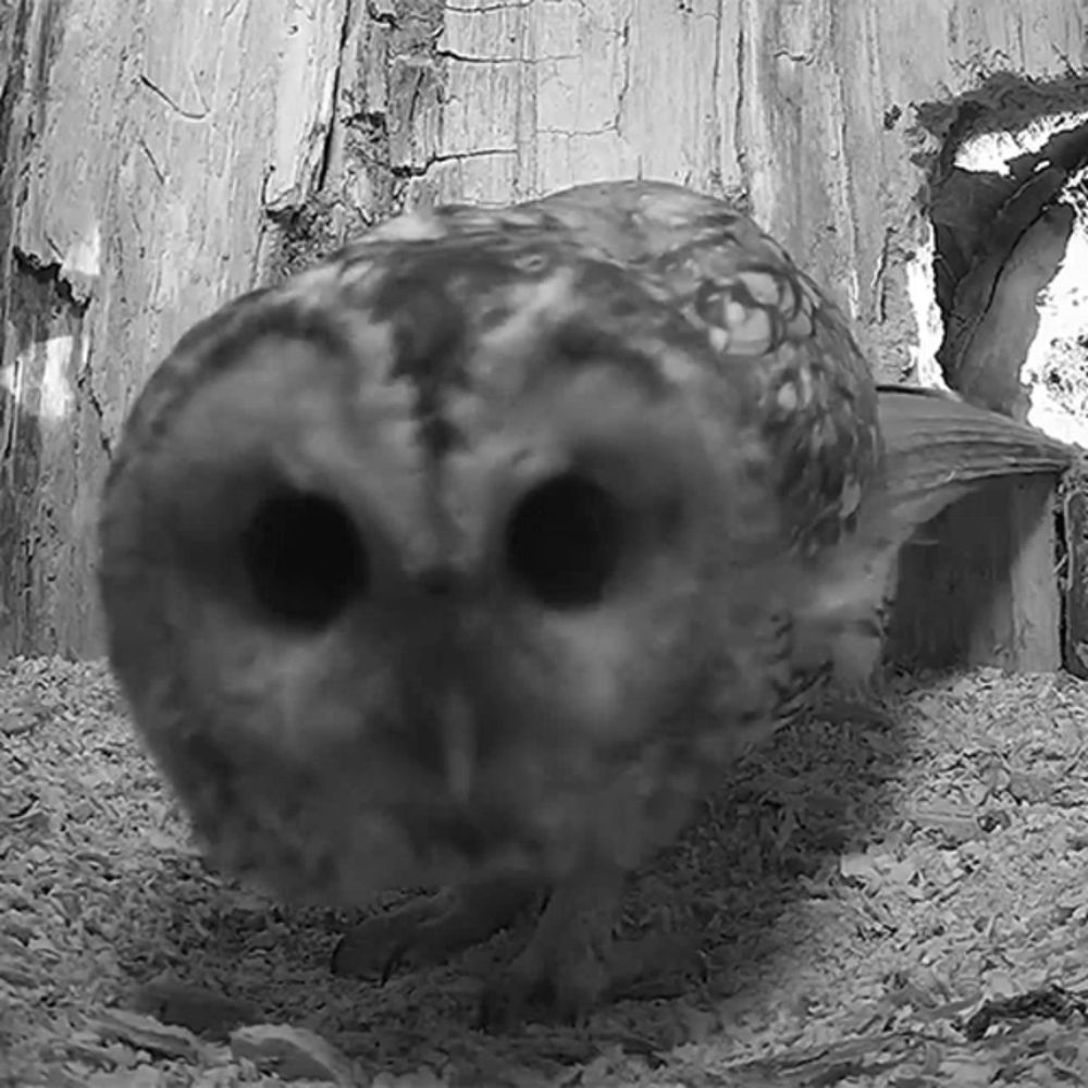 ALT: a black and white photo of an owl standing in a pile of wood chips