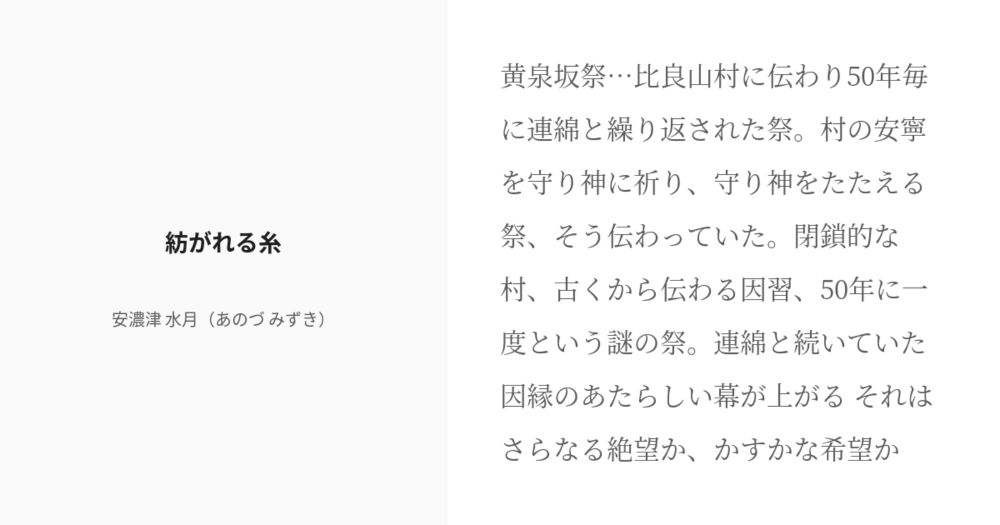 関わると行方不明になると噂される喪服の女(少女)に関わってしまった相原奈央と相原響紀。響紀は女の手にかかり、命を落とす。さらに奈央も狙われて……