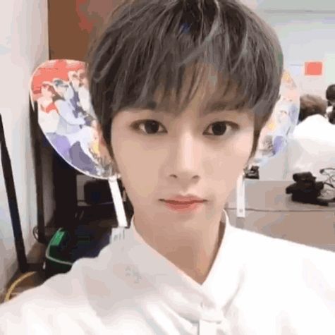 ALT: a young man is taking a picture of himself with a fan in his hair .
