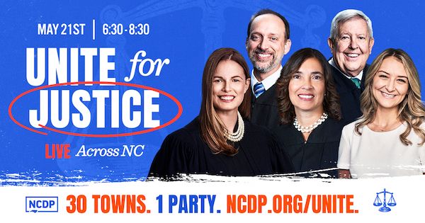 Join N.C. Democrats on May 21 at 6:30pm for Unite for Justice: Live Across NC! It's 30 towns and one big party with NCDP Chair Anderson Clayton, Justice Anita Earls, Justice Allison Riggs, Judge John Arrowood, and Judge Toby Hampson. ncdp.org/unite