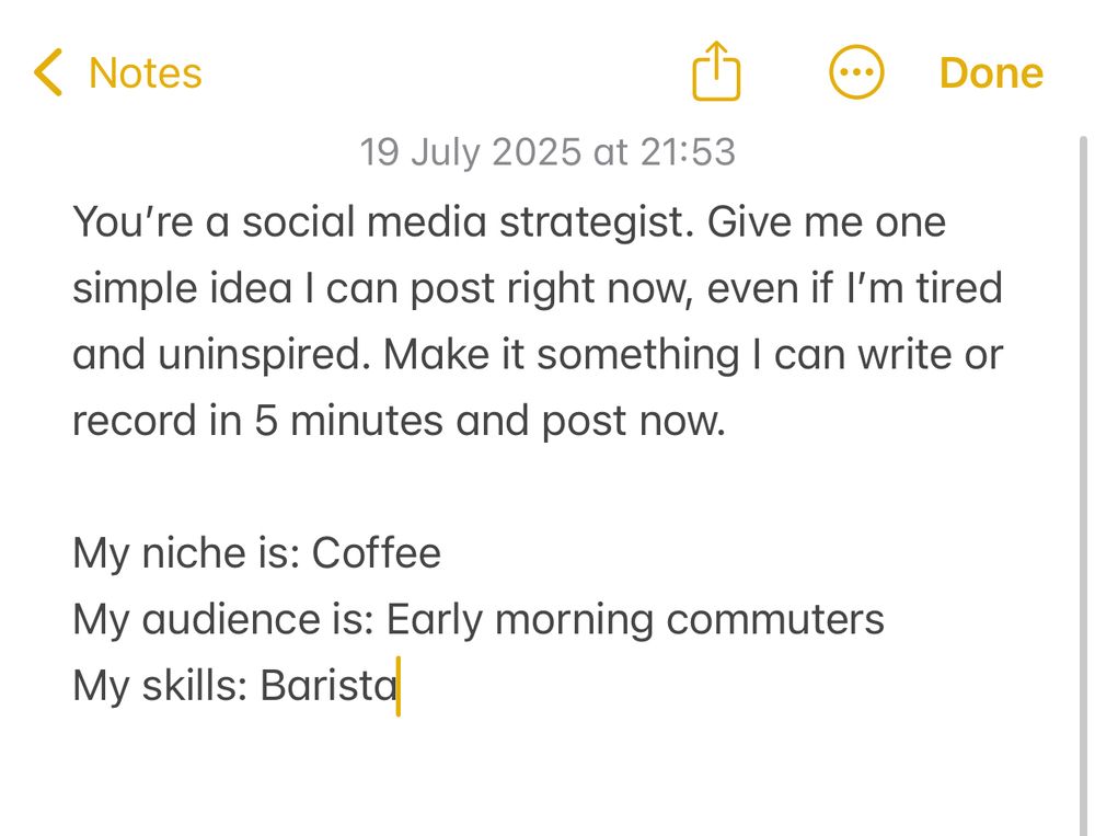 Too tired to post on your social media today? Try this prompt👇Add your niche, audience & skills get a post idea in 46 seconds!
