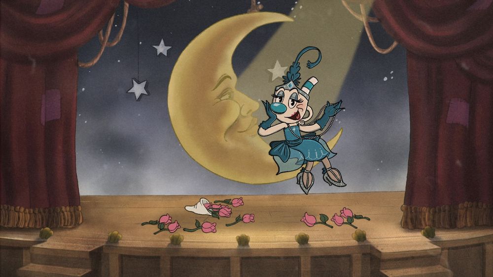 My half of an art trade with my friend Boo featuring their Future AU with Mugman living her best showgirl dancer life (but it came at a cost 😈)