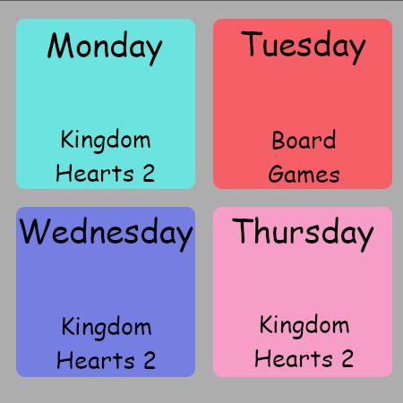 Coming up this week is more Kingdom Hearts 2 and Community Game Night over on Board Game Arena. Unfortunately I'm double booked on Wednesday and will need to cancel stream that day.