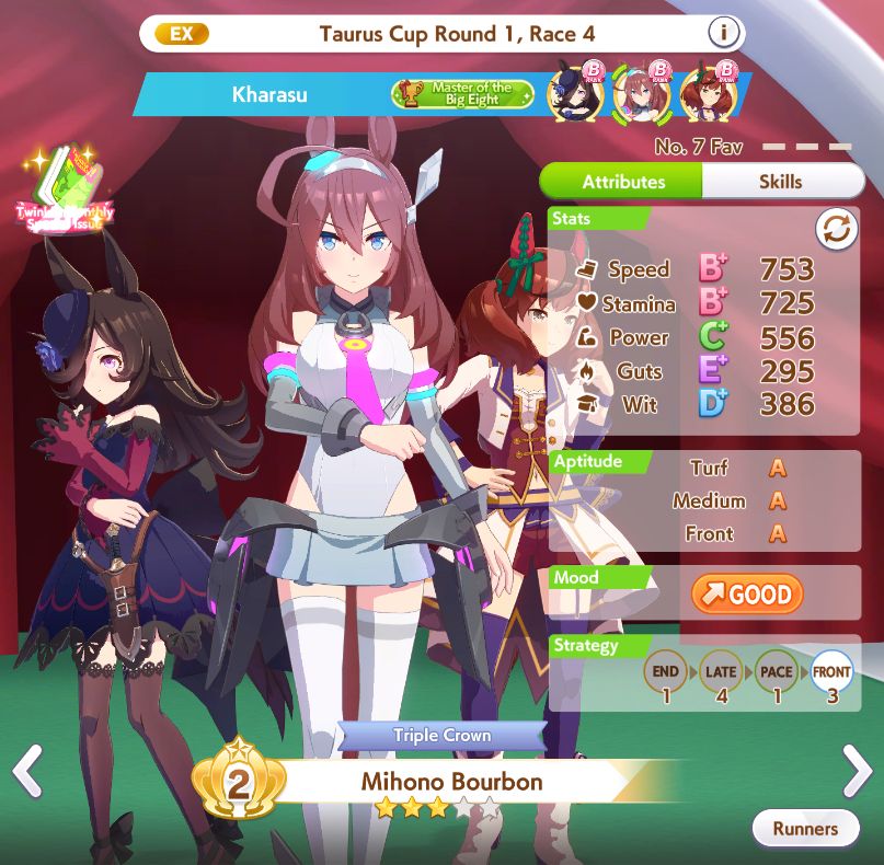 Mihono Bourbon muchas veces acaba delante de ella por lo que le ayuda a activar su ulti a pesar de ir Front.
