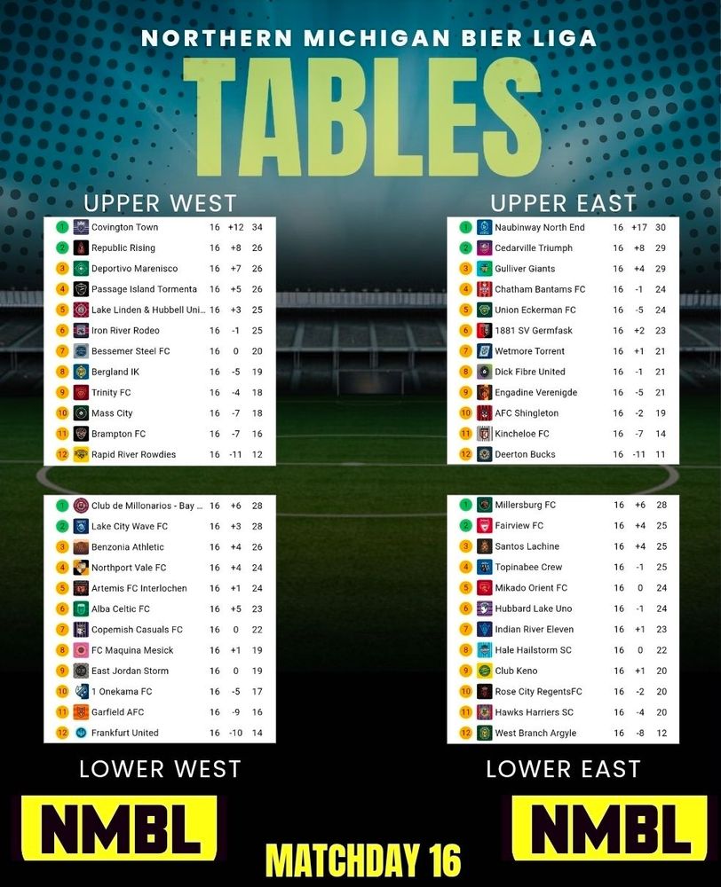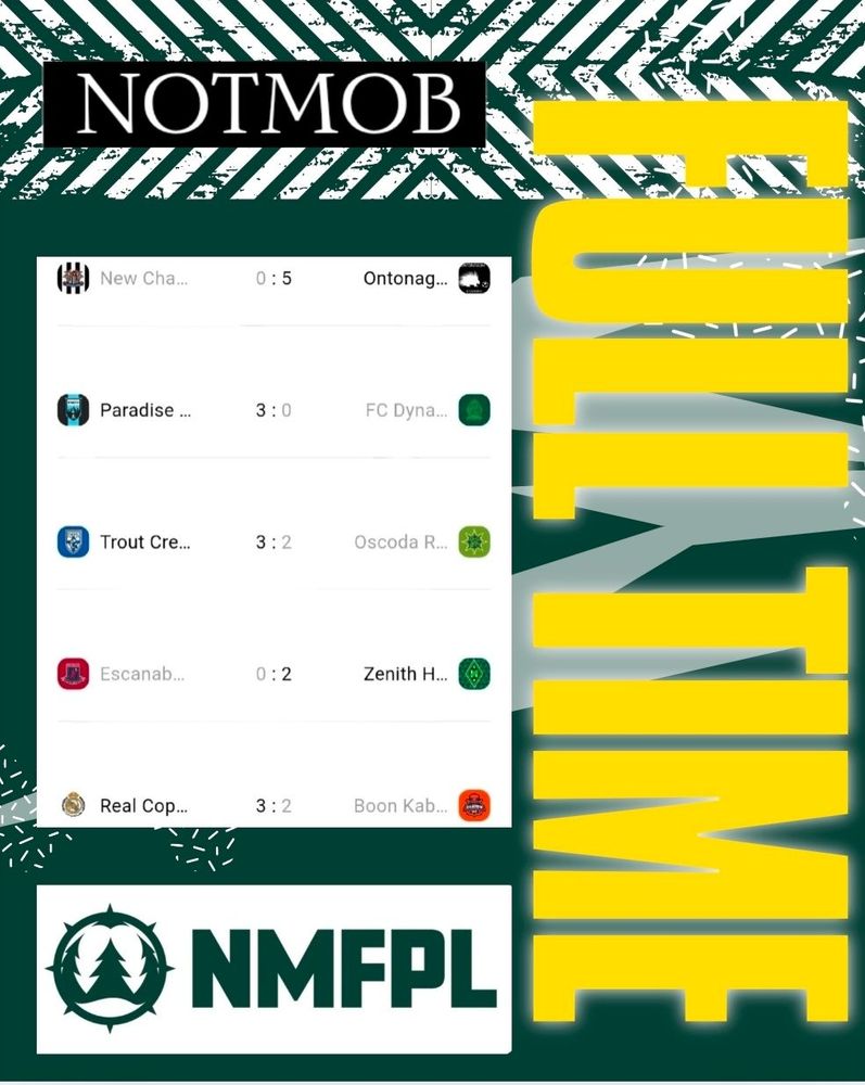 Today's winners are Manitou United, AFC Houghton Lake, Gladstone & Drummond Sandhills. Huron Mountain & Petoskey Stones draw.