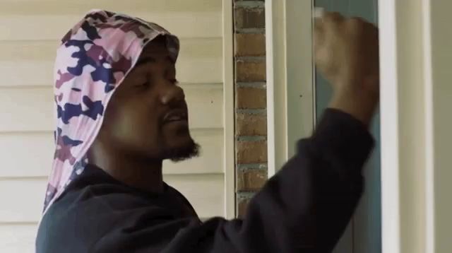 a man wearing a pink camo head scarf is standing in front of a window