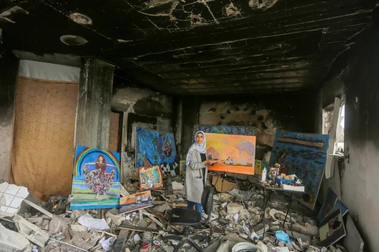 Before the genocide, her work was shown in art galleries around the world; she sees her art as a way to tell people about life for Palestinians.