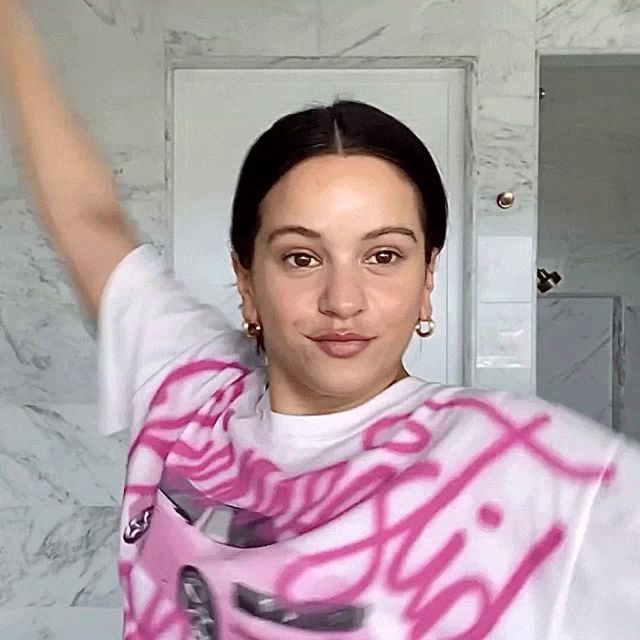 ALT: a woman wearing a pink and white shirt that says ' barbie '