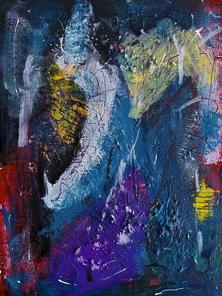 Painting without form, without knowing what will happen — an instinctive flow that slowly rationalises itself, brush after brush, layer after layer, until calm arrives in a red line.