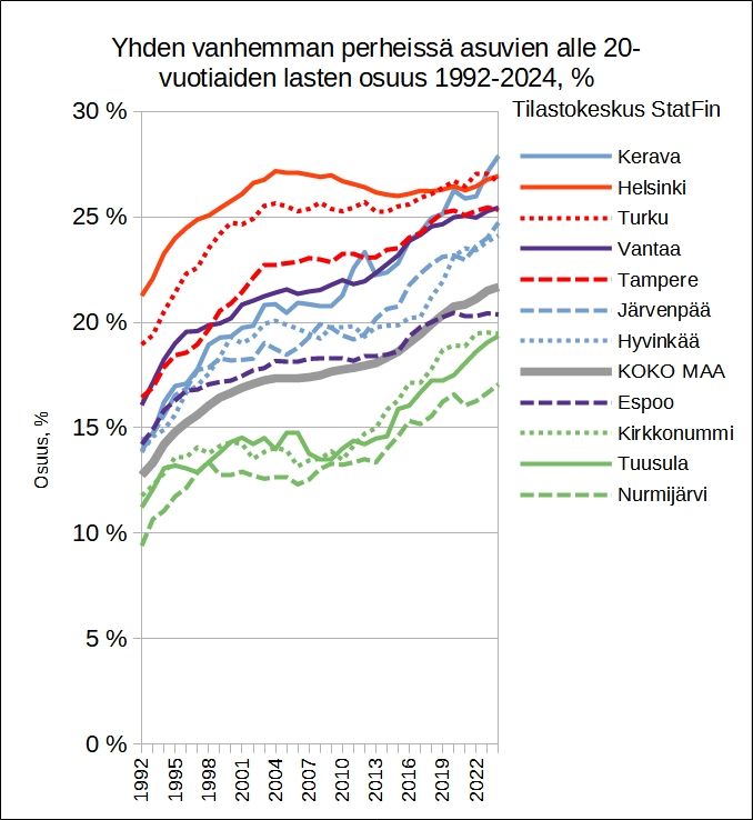 Perhetilastot 2024 @stat.fi . Yhden vanhemman perheissä asuvien lasten osuus on koko maassa 21,7%, kasvu kiihtyi 2015 jälkeen. Keskuskaupungeissa paljon, koska hyvät palvelut autottomille ja vähemmän okt-asumista. Nyt myös kehyskunnissa nopea kasvu. Hki ollut 20 vuotta sama.