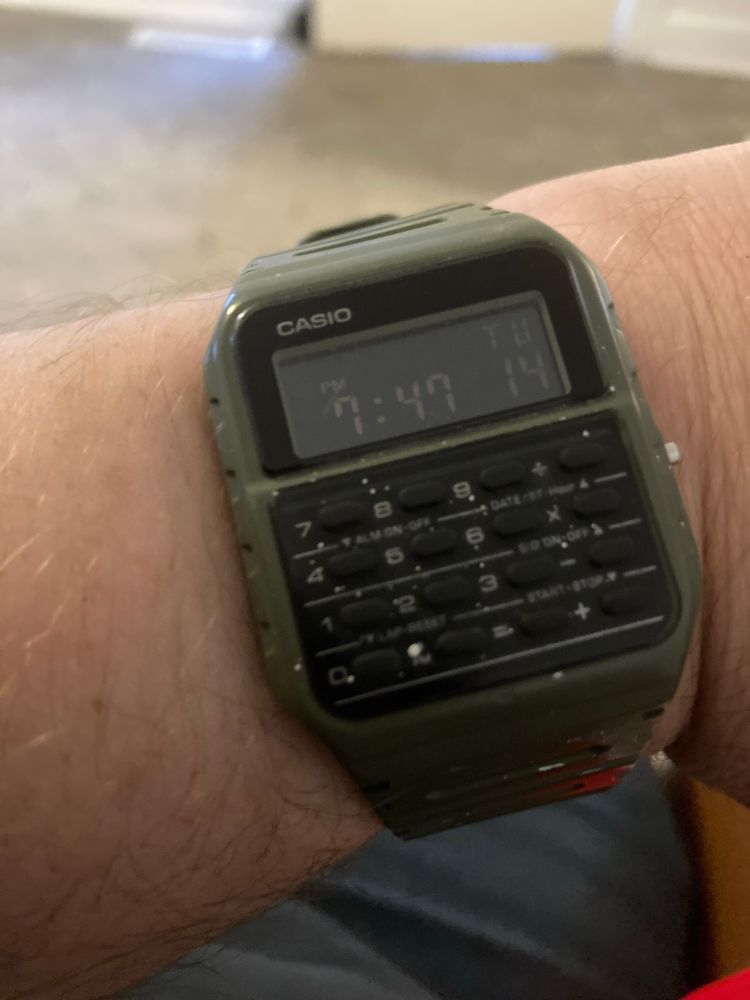 Here’s my Casio CA-53W calculator watch, worn by the likes of Marty McFlurry and Walter Breakingbad. This is the navy green variant. Also visible are my arm hairs and a freckle, and also part of my arm. Hope you enjoy. #mywatch