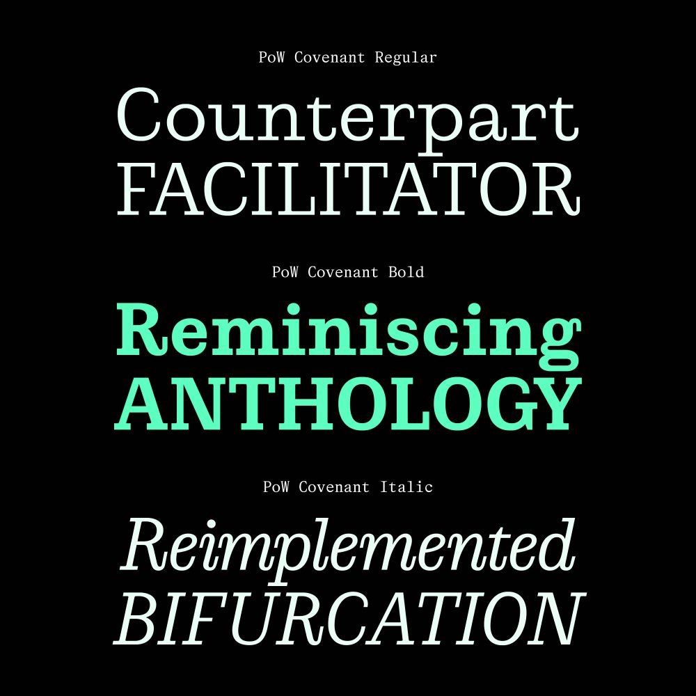 Let’s introduce our foundry catalogue: PoW Covenant is a contemporary interpretation of Scotch Roman typefaces of the early 19th century. Its dry structure showcases a process of mechanization & simplification combined to a low contrast. PoW Covenant is available in 14 styles, on proof-of-words.com