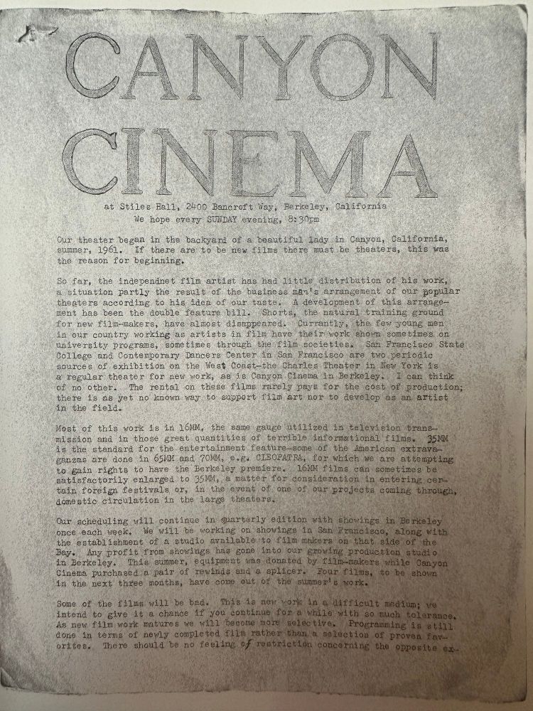 Canyon Cinema program handout from 1962. My favorite part: “Some of the films will be bad…. There should be no feeling of restriction concerning the opposite expression to applause: absolutely lousy work, accepted in silence, is liable to be mistaken for something magically beyond comprehension.”