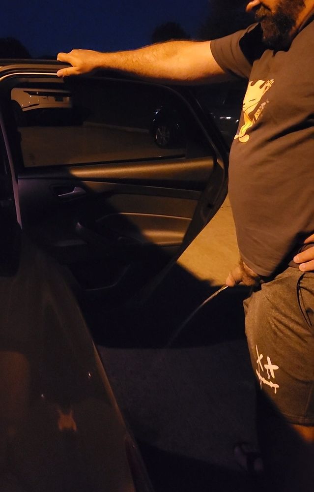 Dad pissing by the car.