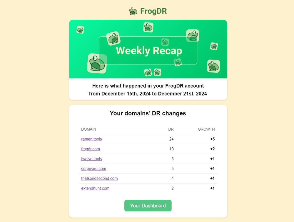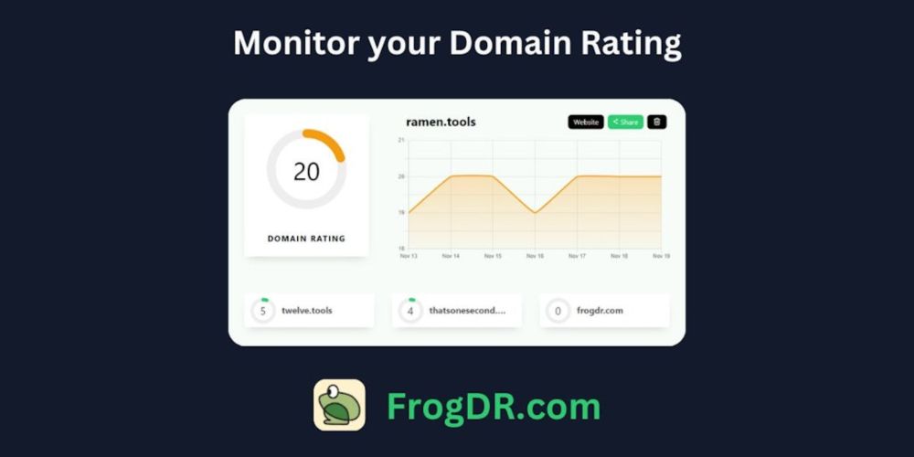 FrogDR is a tiny tool that monitors your websites' Domain Ratings, everyday.