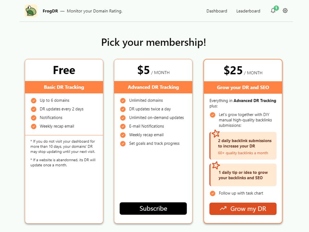 If you want to get some of this authority juice, there is a dofollow link to get on your FrogDR domain page if you either use the $5/month plan or add the DR badge on your website to showcase your DR.