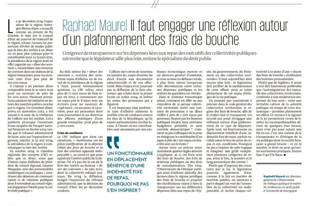 Dans l'édition du Monde datée du jour, ma tribune, en tant que directeur général de l'Observatoire de l'#éthique publique, sur les frais de bouche et de représentation au sein des collectivités territoriales, notamment à la suite de l'affaire de la région AURA.