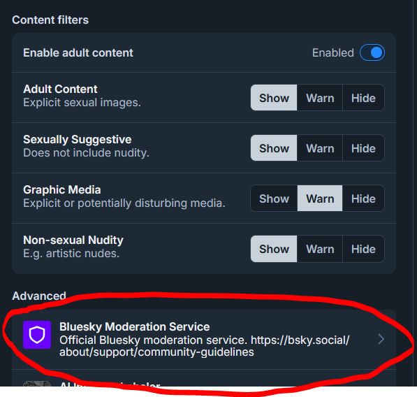 SETTINGS > MODERATION > Bluesky Moderation Service > Set to "off"
