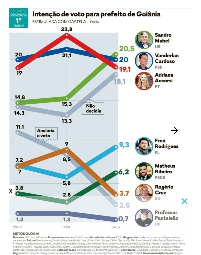 Sandro Mabel (UB) cresce 5,2 p.p. e lidera pesquisa Serpes/O Popular de intenção de voto para prefeito de Goiânia. O candidato da base governista tinha 15,3% na 2a rodada da pesquisa, divulgada no dia 16 de agosto, e agora, a 30 dias da eleição, aparece com 20,5% das intenções de voto.