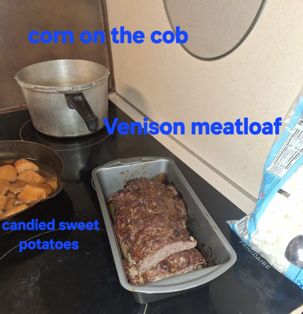 Our meal of Venison meatloaf with Corn on the Cob and Sweet potatoes and later a P'kan pie.