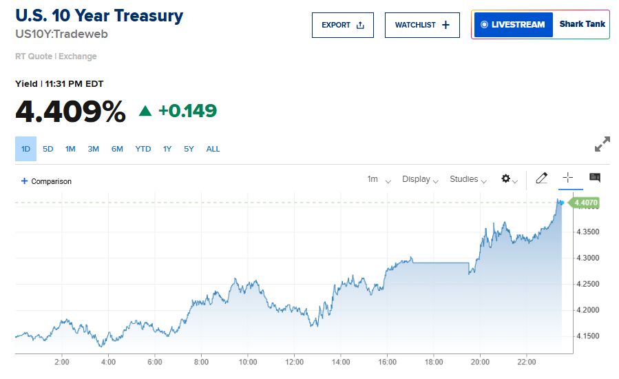 JUST IN 🚨: 10-Year Treasury Yield soaring above 4.4% for the first time since February - Scott Bessent in Panic Mode