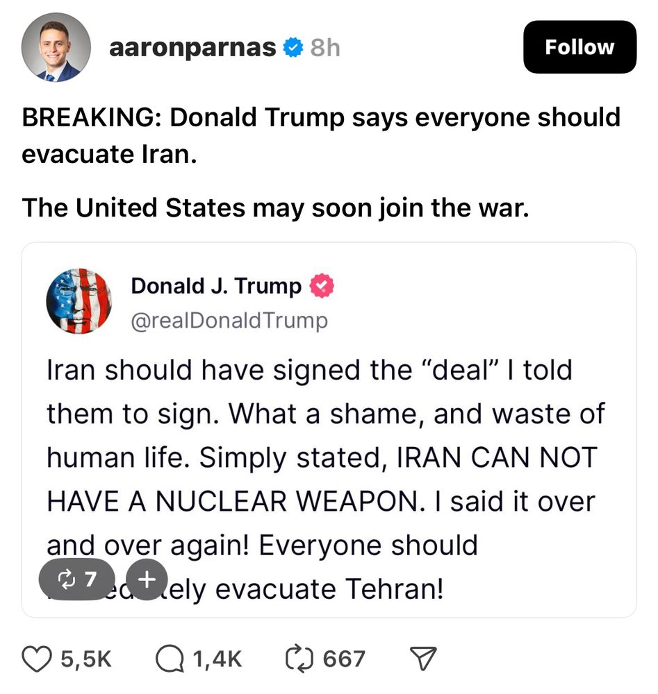 What ever that means. The US is not even Israel, which attacked Iran. Perhaps Trump & #TrumpClan has their #DrillBabyDrill🛢️⛽️ mostly in their mind when he keeps writing these global demands..