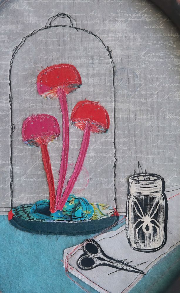 'Mushrooms' - cotton fabric, ink, machine freemotion embroidery.