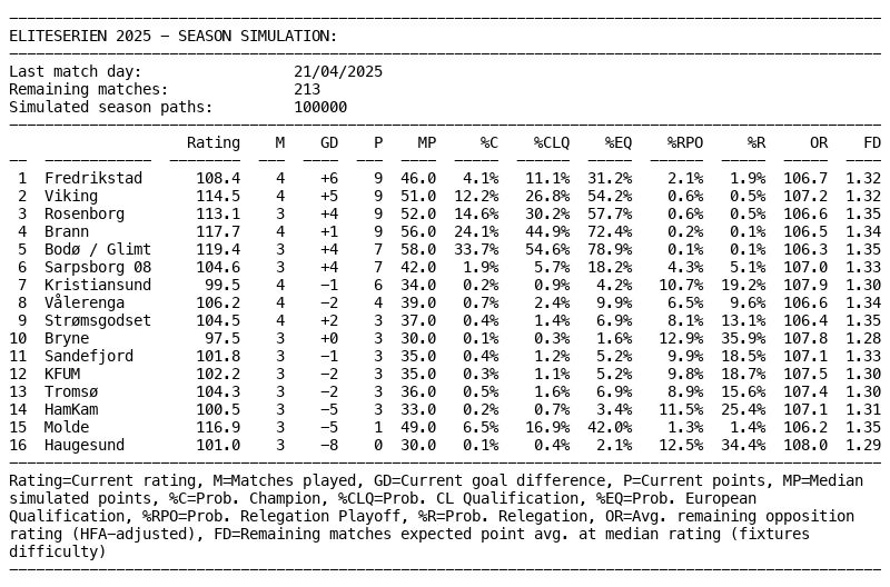 - 5 lag mellom 13% og 24% ss for seriegull: Glimt (24%), Brann (23%), RBK (19%), Viking (17%) og FFK (13%)