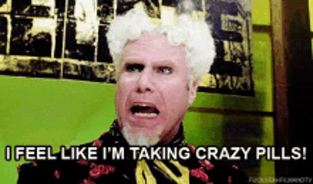 a man with white hair is saying i feel like i 'm taking crazy pills