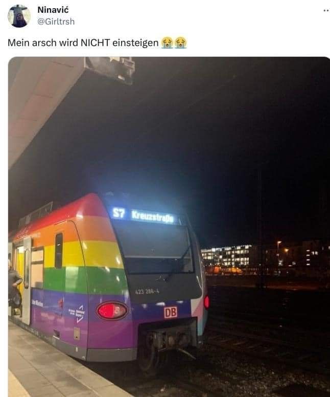 Das ist doch genial! Bahn fahren ohne homophobe Hinterteile. Soll sie doch laufen. 🏳️‍🌈 ❤️