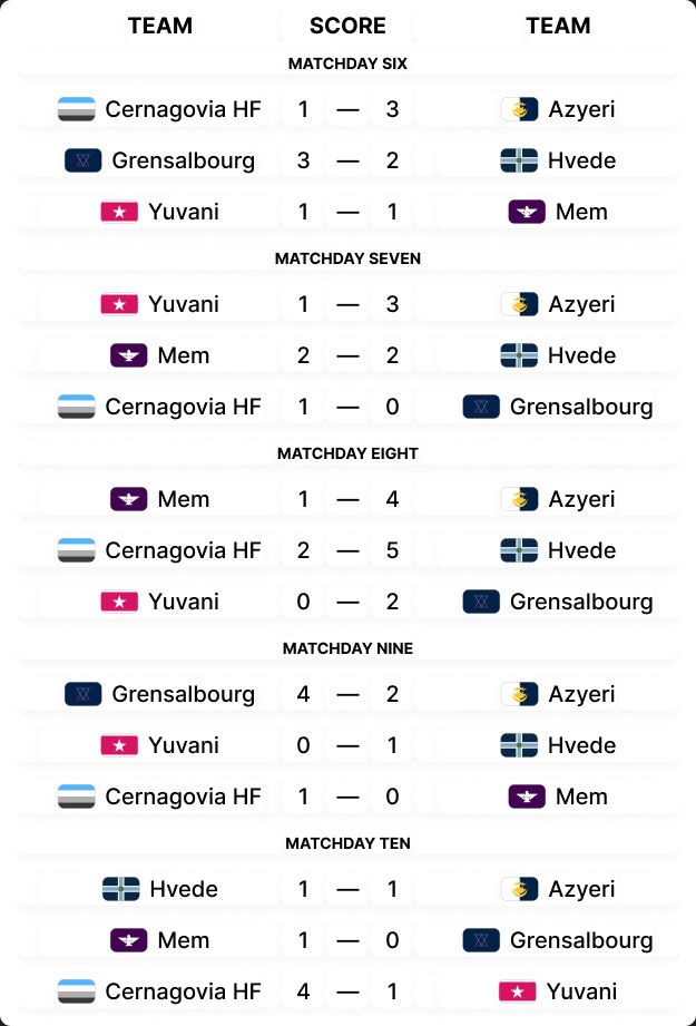 Group 1 consists of Azyeri, the Hveden Federation, Grensalbourg, Mem, Yuvani, and debutant Cernagovia!